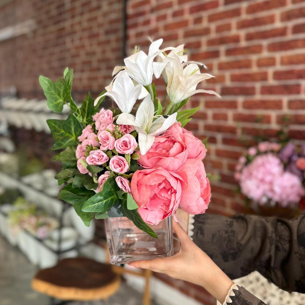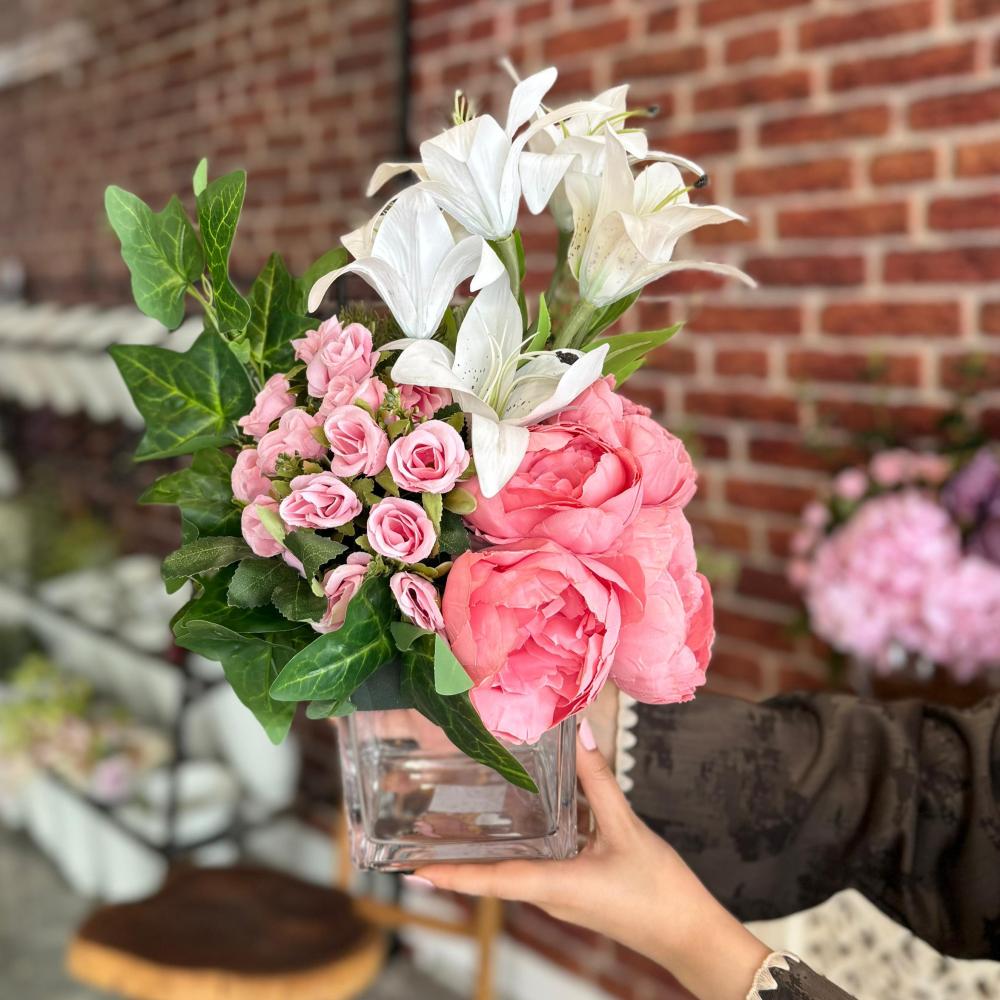 تنسيق زجاجي أنيق يجمع بين نعومة الورود الوردية، وسحر الزنابق البيضاء، وسط أوراق خضراء تضيف حيوية متجددة.