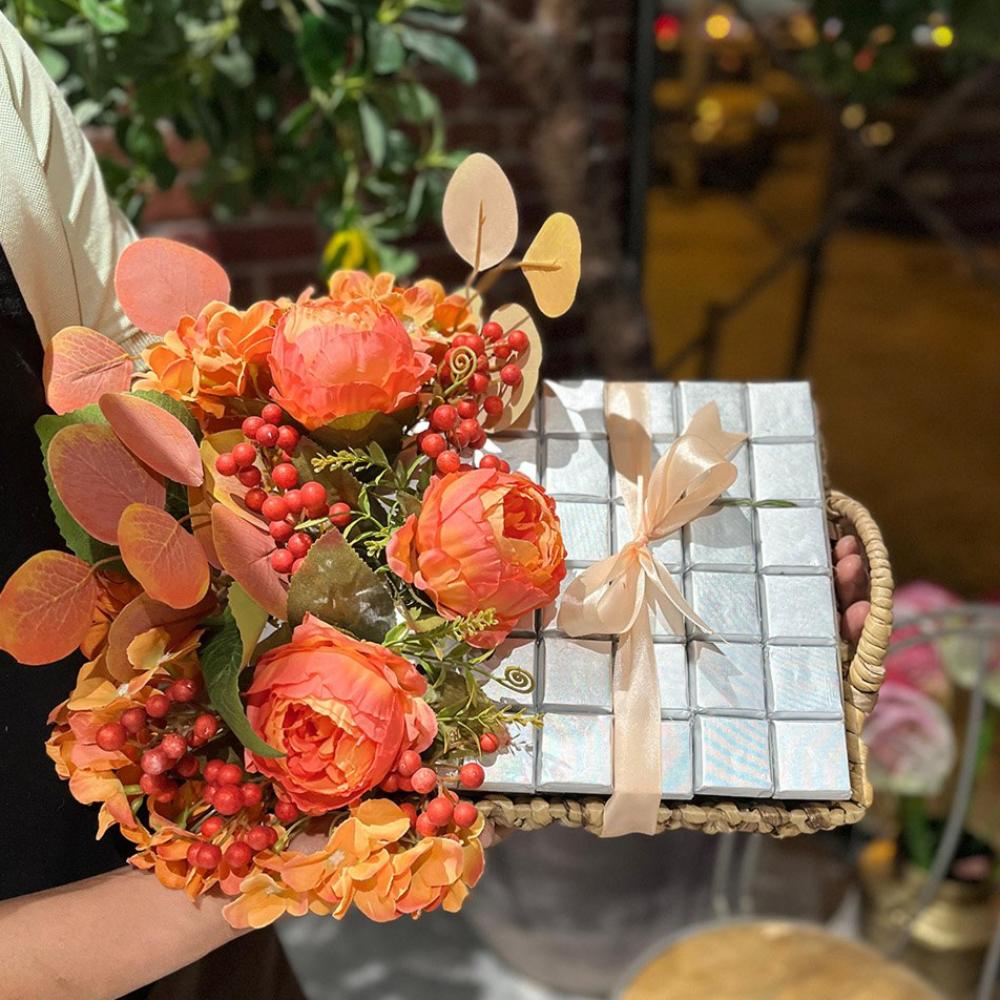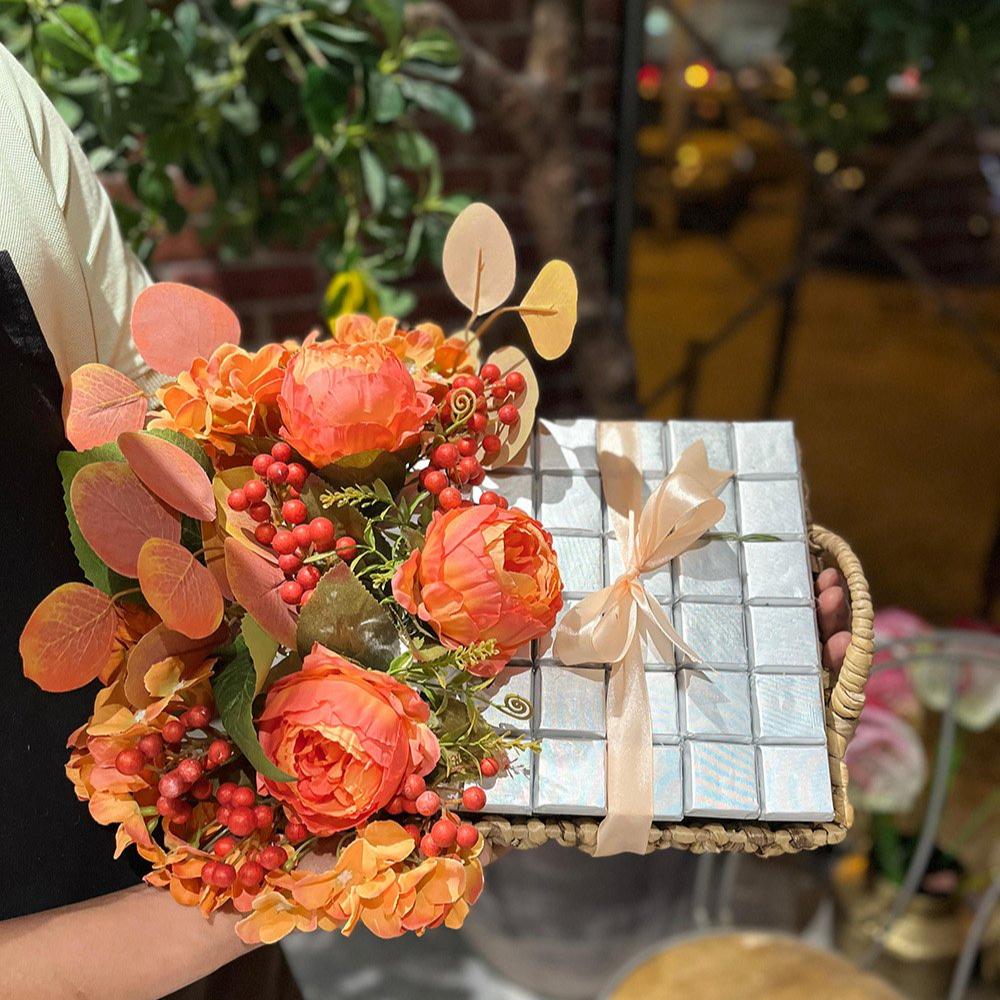 - التصميم: سلة ورد بتنسيق كلاسيكي مع شوكولاتة