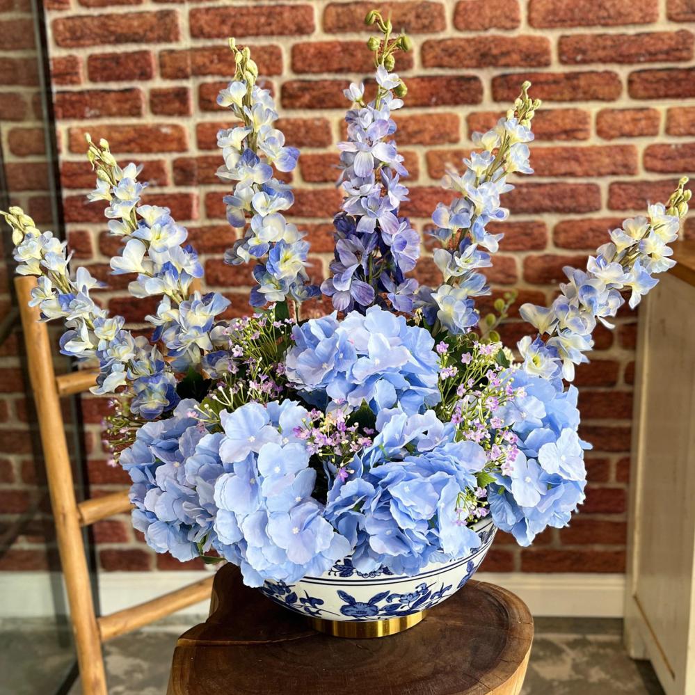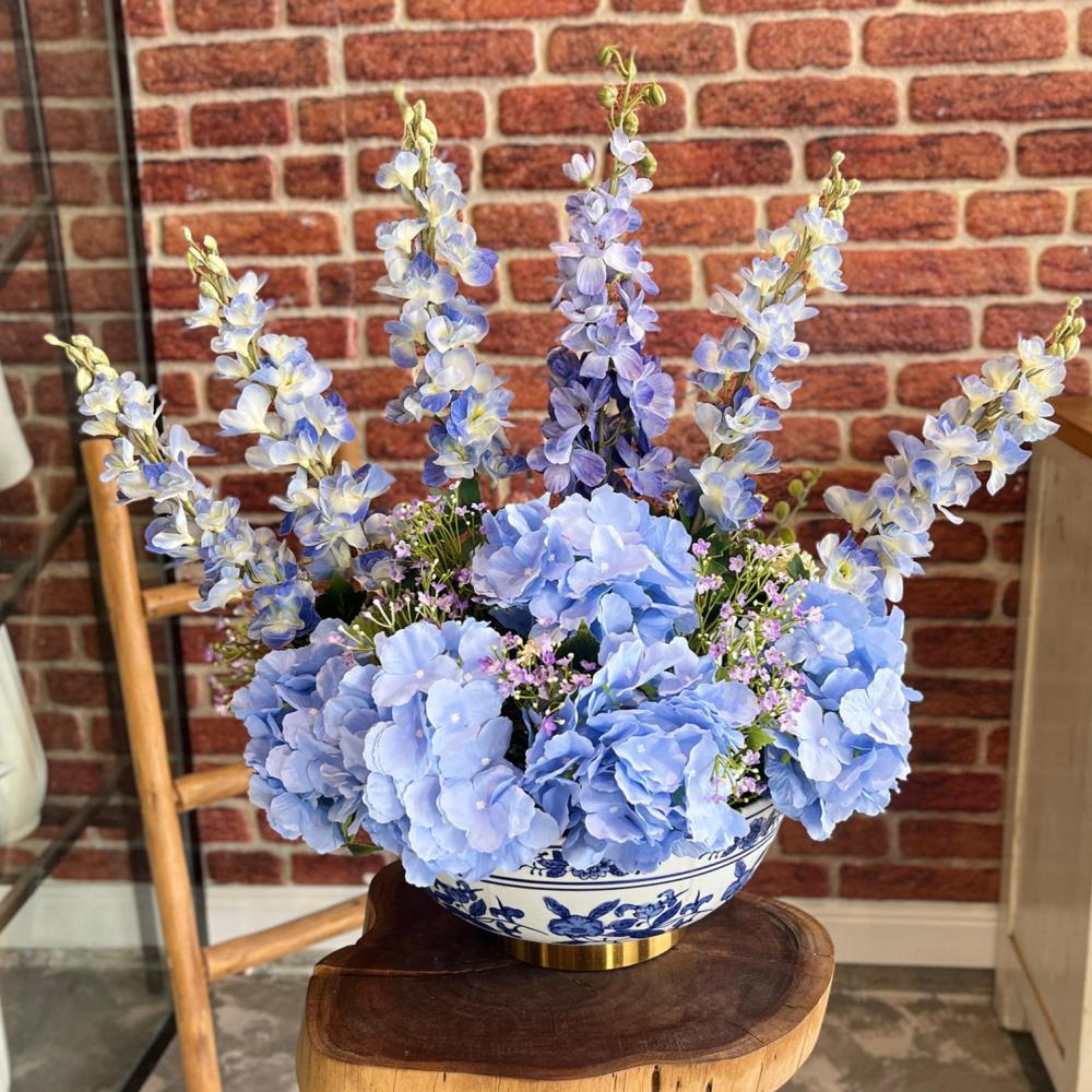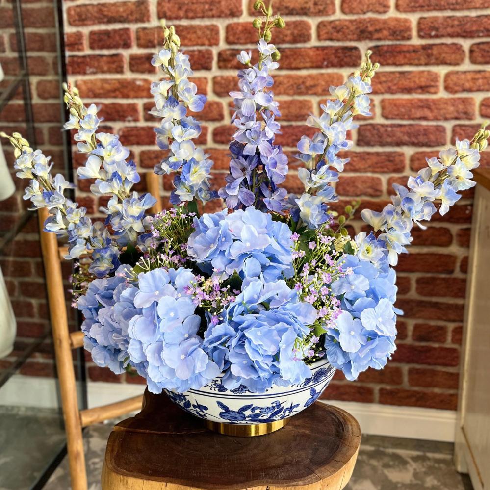 فازة أنيقة تحمل لمسة من الفخامة والهدوء، مصممة بعناية من ورود صناعية عالية الجودة باللون الأزرق السماوي والبنفسجي الهادئ. تضم باقة من أزهار الهيدرنجا المتناثرة مع سيقان طويلة من الدلفينيوم لتضفي مظهرًا عموديًا مميزًا يملأ المكان بالحيوية.