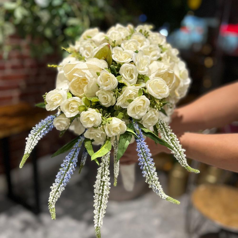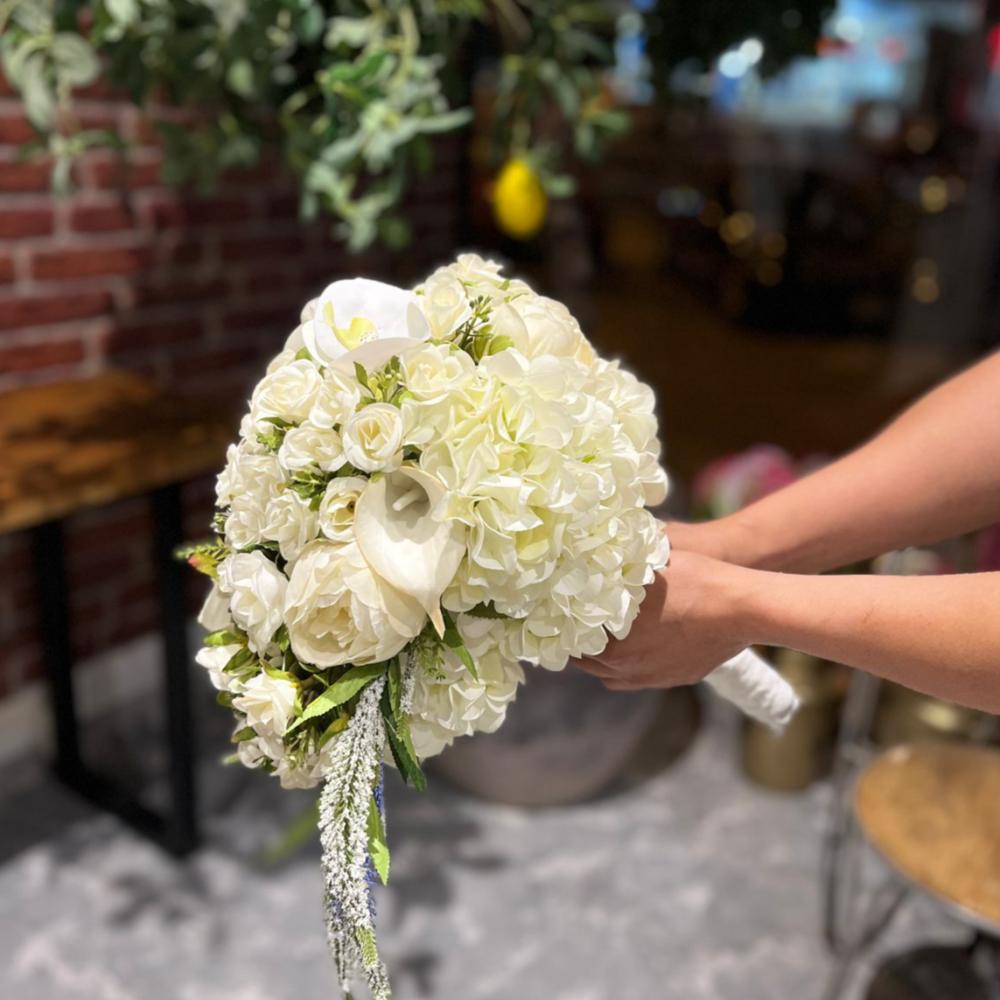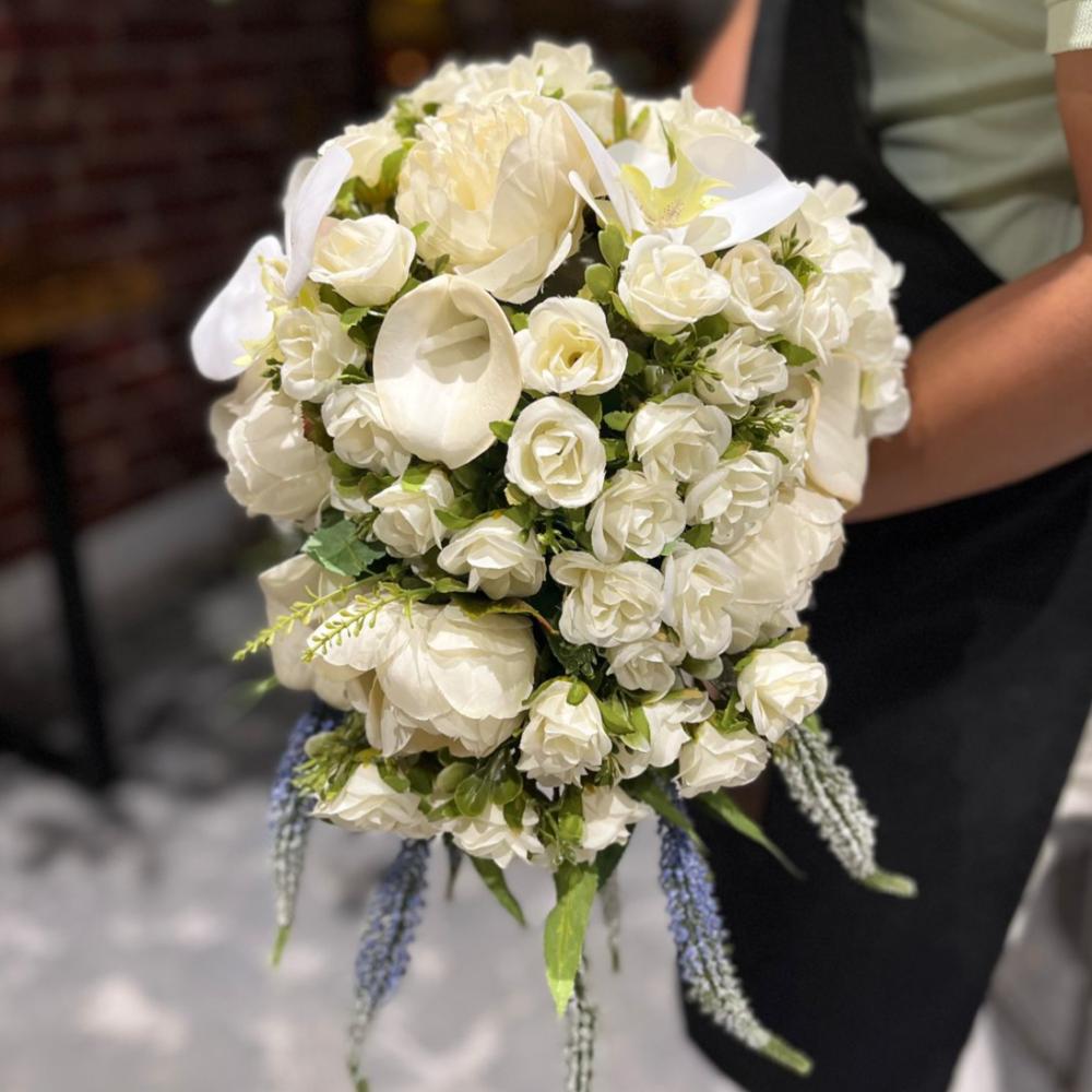 - التصميم: باقة عروس من زهور الهايدرينجا البيضاء، الكالا، الجوري البيضاء، والفيرونيكا