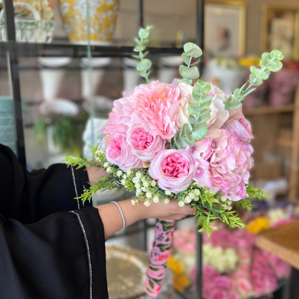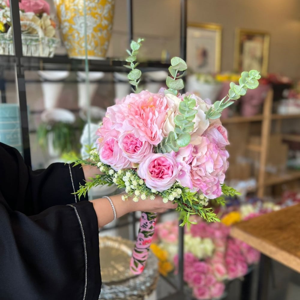 - التصميم: مسكة عروس من ورد صناعي وردي مع أوراق خضراء
