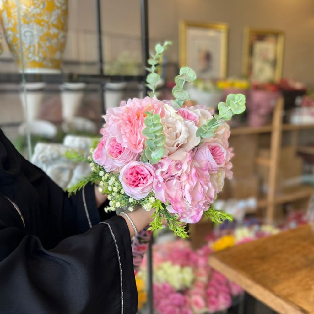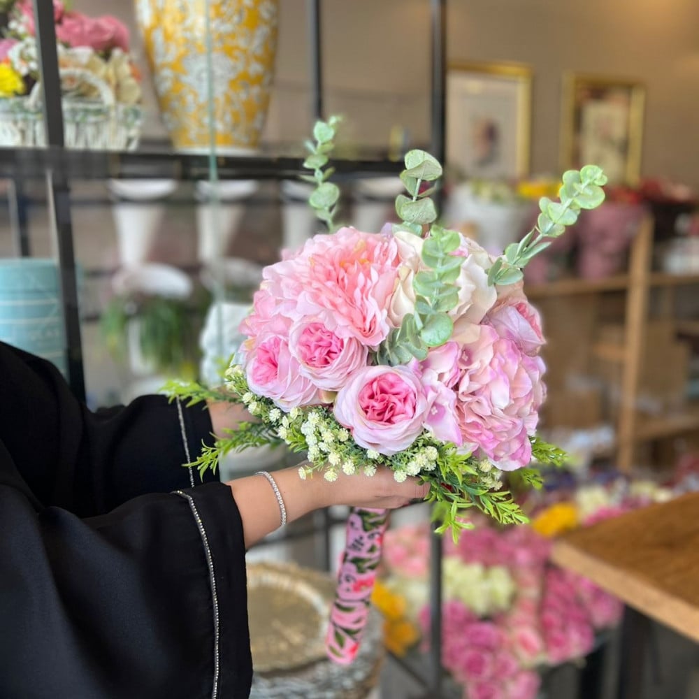 اطلبيها الآن من إياد فلاورز .. وأكملي إطلالتك يوم زفافك بـِ مسكه الورد الأنيقة من الورد الوردي الناعم