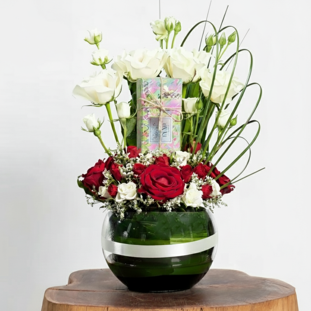فازة أنيقة تجمع بين الورود البيضاء الهادئة والورود الحمراء الكلاسيكية في تنسيق متوازن يعبّر عن النقاء والحب في آن واحد. يزينها تصميم زجاجي عصري يمنحها حضورًا فاخرًا يليق بالمناسبات المميزة.