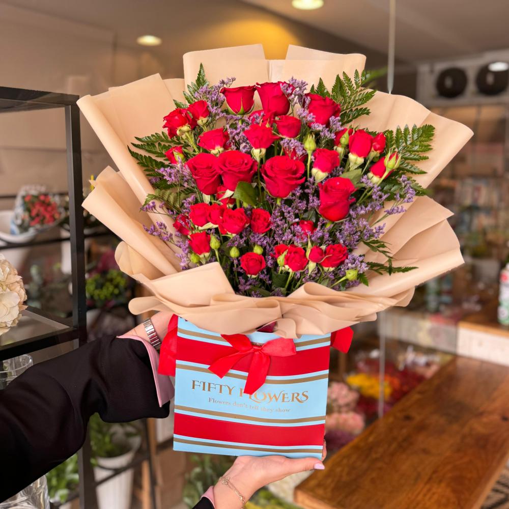 - باقة ورد مميزة تنطق بالرقي بفضل ورود الجوري الحمراء الفاخرة.