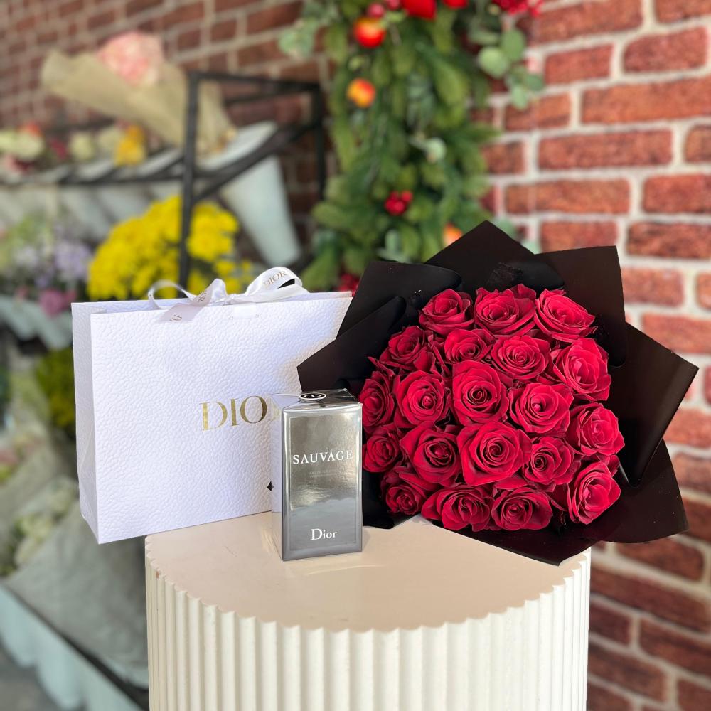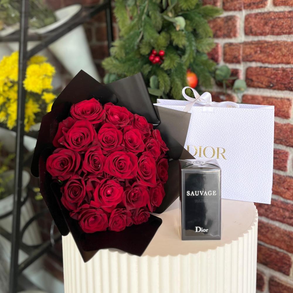 - التصميم: تنسيق هدية عطر مع ورد من ورد الجوري الأحمر وعطر رجالي فاخر