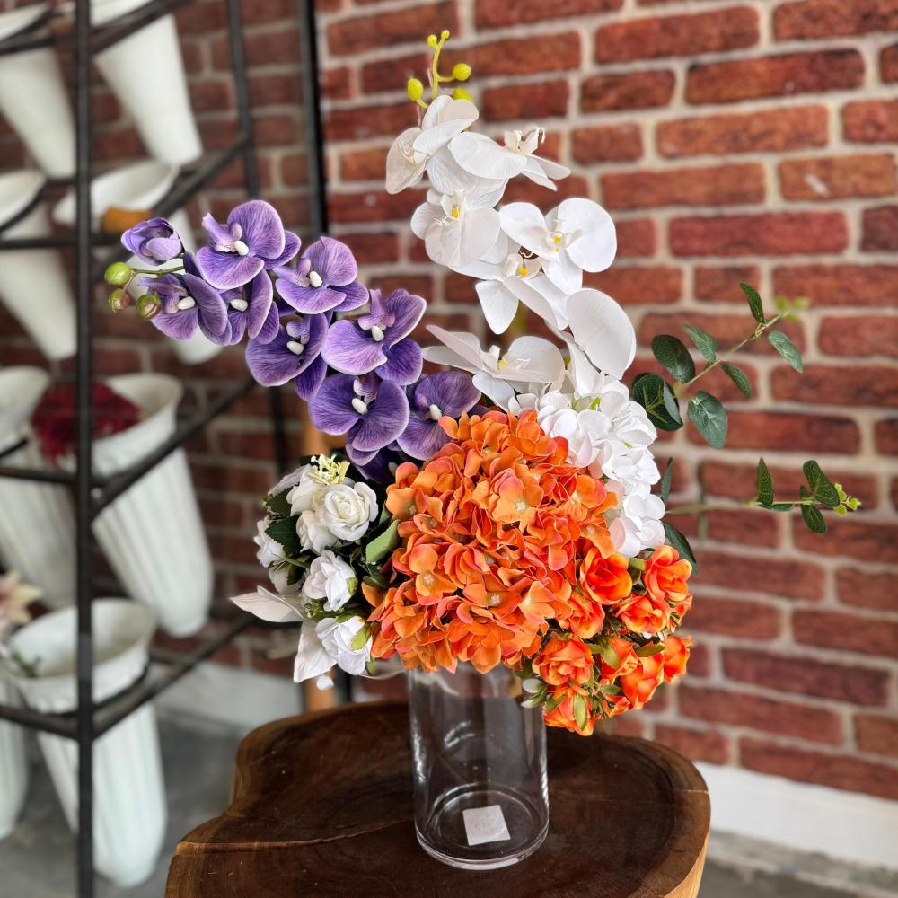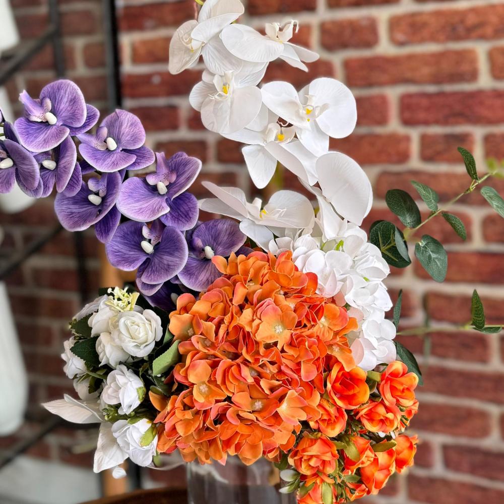 فازة ورد صناعي أنيقة تجمع بين جمال الألوان وفخامة التصميم. تنسيق متناسق يضم زهور الأوركيد البيضاء والبنفسجية الفاخرة مع لمسات من الهيدرنجا البرتقالية المشرقة والورود البيضاء الصغيرة، في قاعدة زجاجية شفافة تضيف لمسة عصرية راقية. مثالية لإضفاء أجواء حيوية وفاخرة على ديكور المنزل أو المكتب، كما تعد خيارًا مميزًا للهدايا في مختلف المناسبات. تصميم يدوم طويلًا دون الحاجة للعناية، ليحافظ على جماله ورونقه على مدار العام.