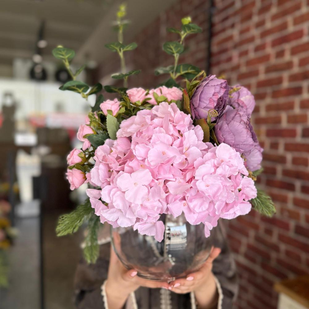 تنسيق فاخر من الورد الصناعي عالي الجودة، يجمع بين الهايدرنجا الوردي الناعم، وورود فاتحة بألوان متقاربة تنسج مشهدًا هادئًا وراقٍ داخل فازة زجاجية دائرية شفافة.