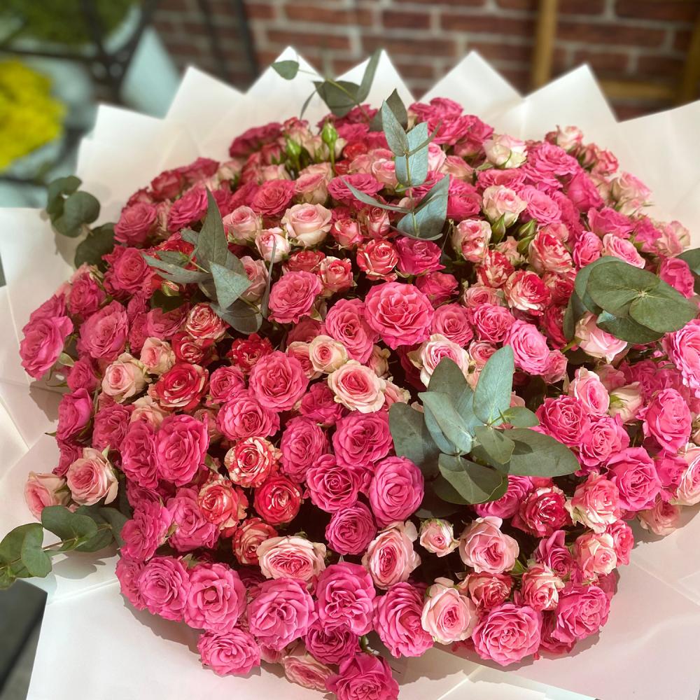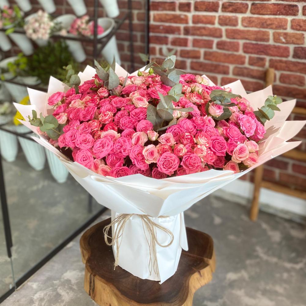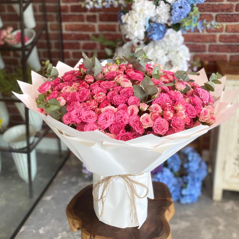 باقة فاخرة تنبض بالجمال، تجمع ورود الجوري بدرجات وردية متدرجة من الفاتح إلى الغامق، بترتيب يلفت الأنظار. تكتمل اللمسة بأوراق خضراء أنيقة تضيف توازنًا حيويًا وتبرز روعة الألوان.