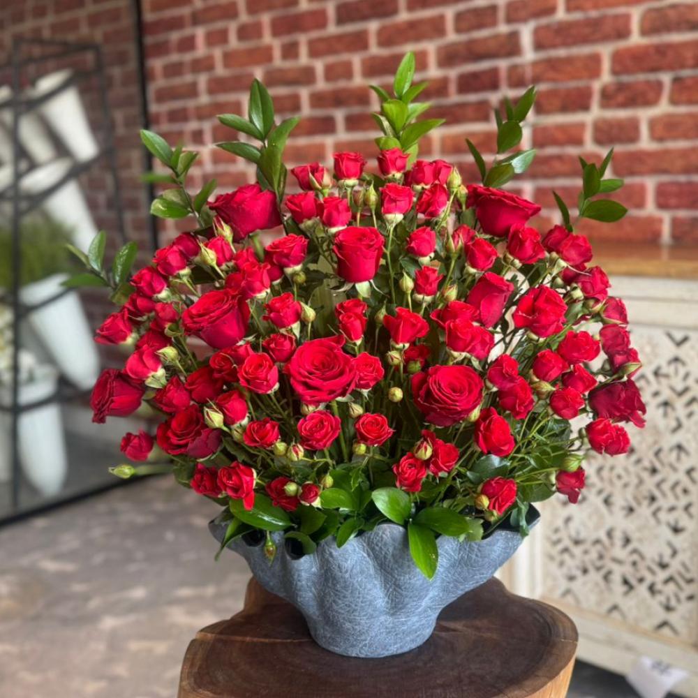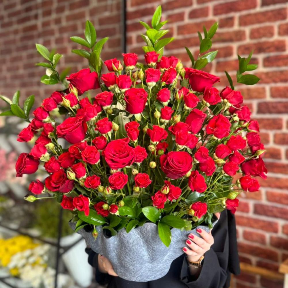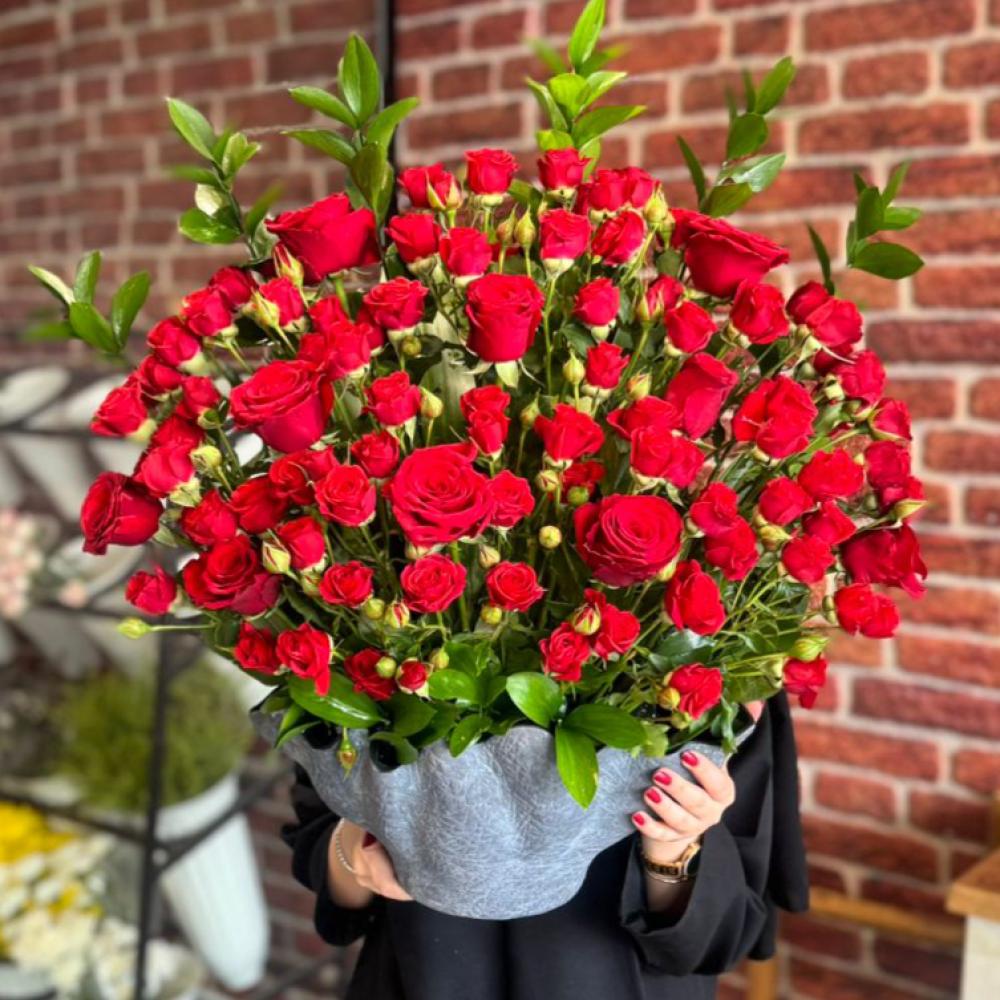 تنسيق ضخم من ورد الجوري الأحمر الكلاسيكي بوفرة آسرة، تتخلله أوراق خضراء أنيقة تضيف امتلاءً وحيوية مضاعفة. يبرز جمال اللون الأحمر ورمزيته العميقة في التعبير عن الحب، الشغف، والاحتفاء.