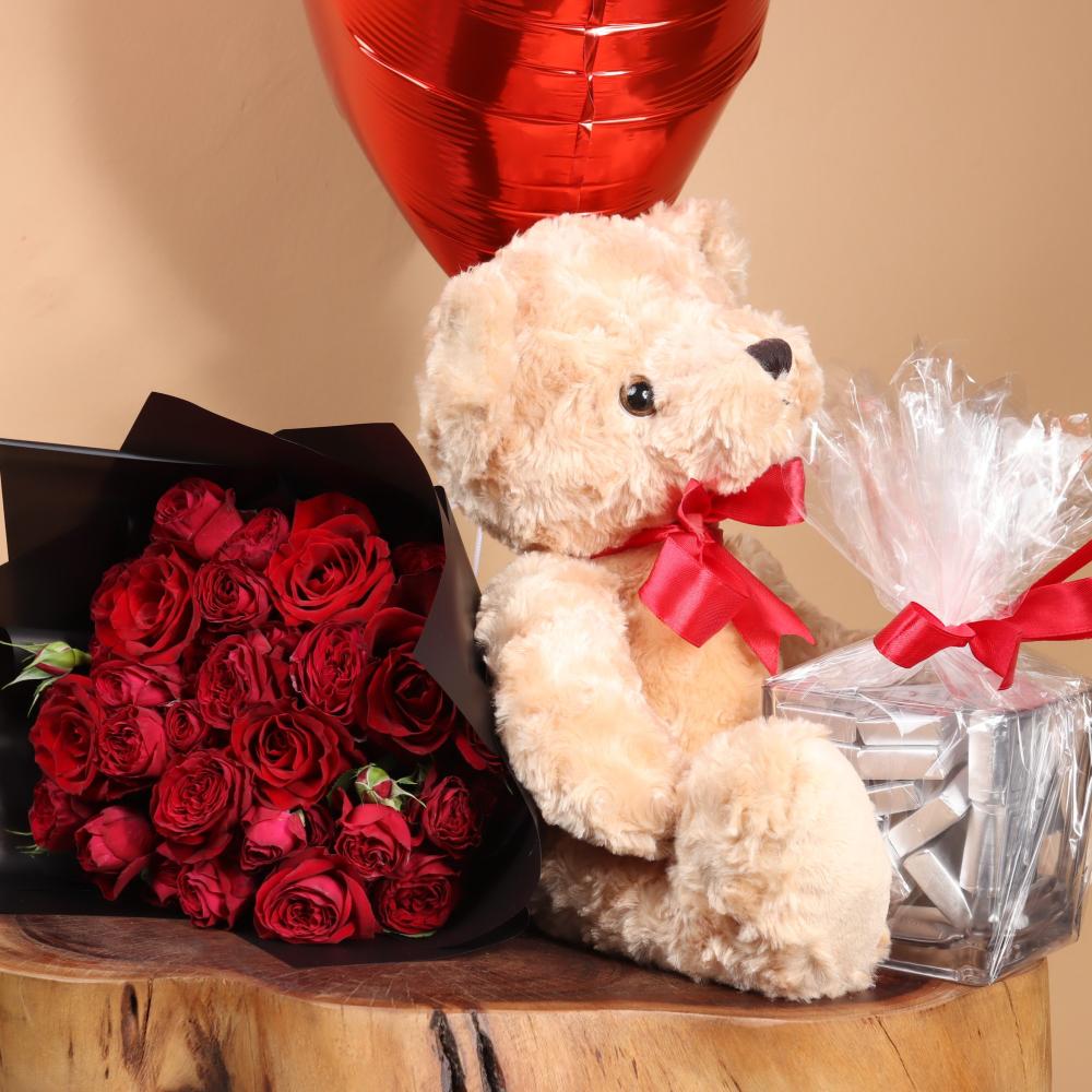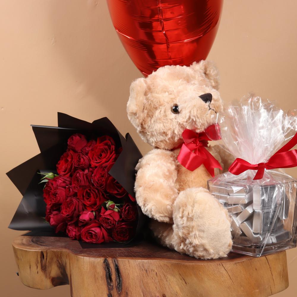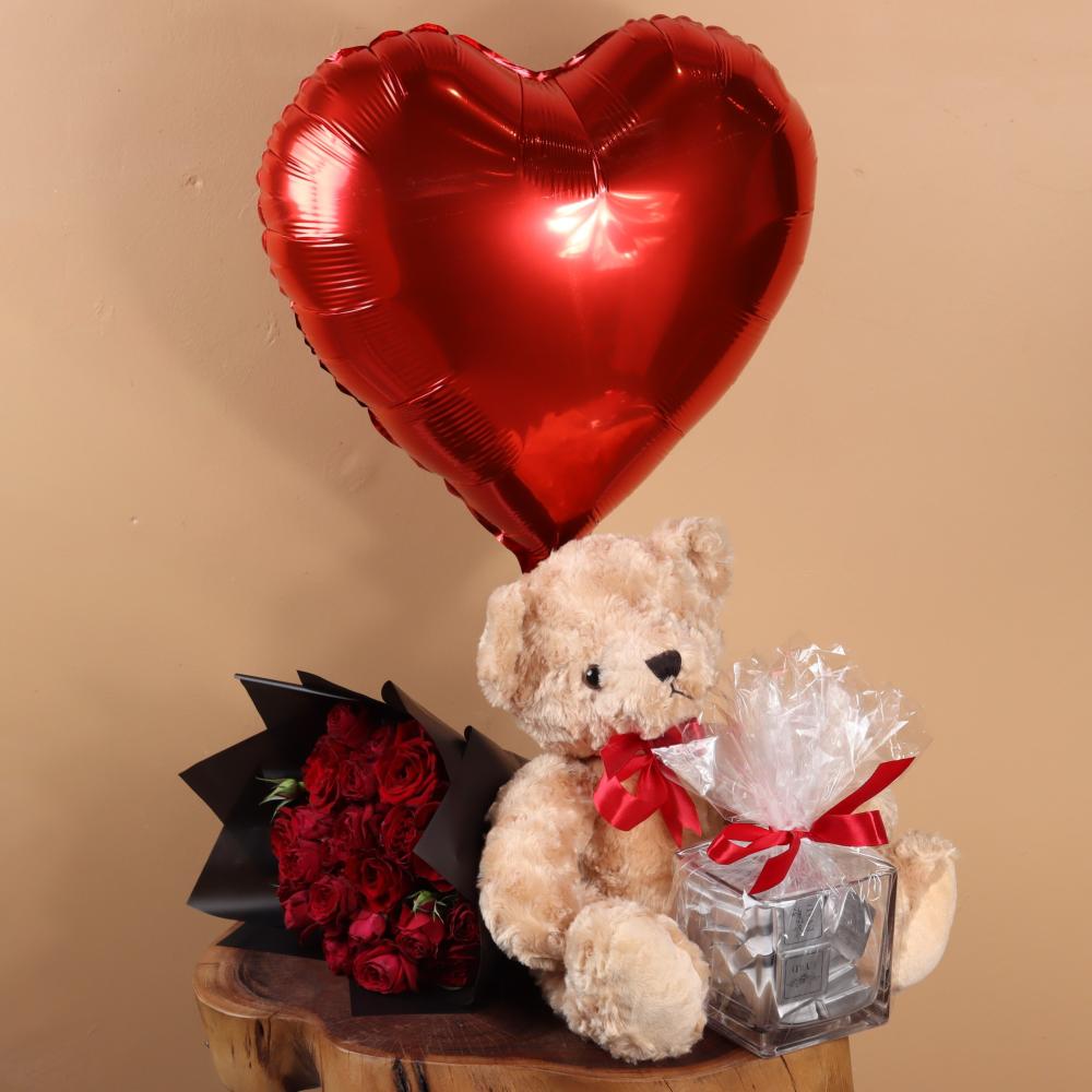 أضف لمسة من الحب والرقي مع هذه التشكيلة المميزة التي تضم باقة ورود حمراء منسقة بعناية، دمية دب ناعمة تضفي دفئًا وحنانًا، وشوكولاتة بلجيكية فاخرة مغلّفة بأناقة. يكتمل التنسيق ببالون على شكل قلب يعكس أجواءً من الفرح والرومانسية. هذه الهدية المتكاملة مثالية للتعبير عن مشاعر التقدير والاهتمام في المناسبات الخاصة مثل أعياد الميلاد وذكرى الحب.